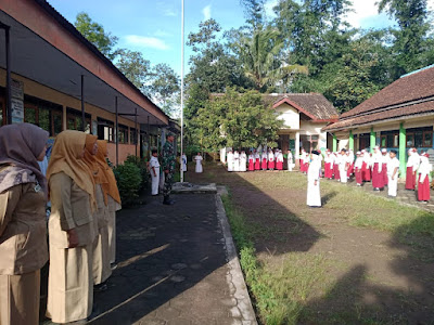 KENDAL - Babinsa Kaligading Koramil 13/Boja Kodim 0715/Kendal Sertu Agung Purboyo sebagai Pembina Upacara pada pelaksanaan Upacara Pengibaran Bendera Merah Putih di SDN 2 Desa Kaligading Kecamatan Boja. Senin (20/3/23).